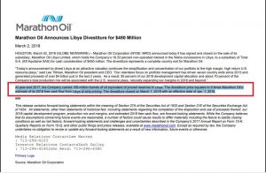 والجدير بالذكر أنه في نهاية العام 2017 ، قامت الشركة بنقل 199 مليون برميل من النفط المكافئ للاحتياطيات المؤكدة في ليبيا، ويعادل هذا سعر البيع إلى 9 مرات حسب تقدير شركة ماراثون أويل لتدفقها النقدي الحر لعام 2018 من ليبيا بأسعار مميتة. تم إغلاق التجسيم في 1 مارس 2018 مع تاريخ نفاذ في 1 يناير 2018.