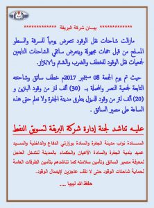 طالبت شركة البريقة لتسويق النفط في بيان لها اليوم السبت المسؤولين بضرورة التدخل لوقف حالات السرقة والسطو المسلح التي يتعرض لها يوميا سائقو الشاحنات التابعين لجمعيات نقل الوقود.
