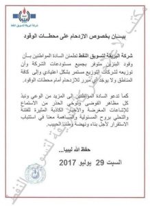 وقد طمأنت شركة البريقة المواطنين بأن الوقود “البنزين” متوفر بجميع مستودعات الشركة وان مستودع طرابلس النفطي مستمر في تزويد شركات التوزيع وأن إستلامها من مستودع الزاوية يصل إلى حد الآن وبشكل إعتيادي ..