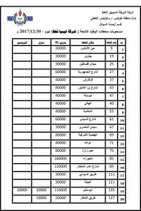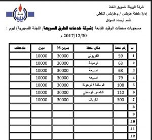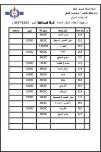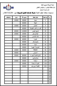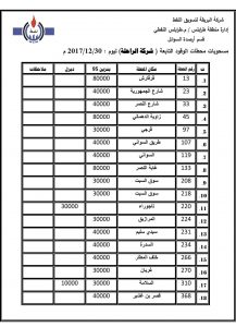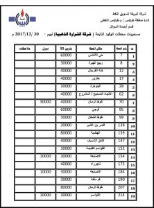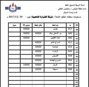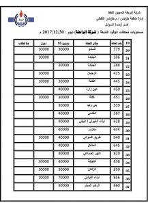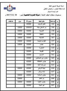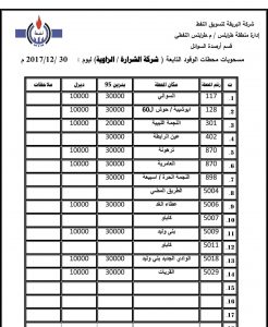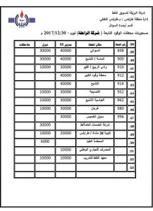 كشفت شركة البريقة لتسويق النفط عن الكميات الموزعة لوقود البنزين والديزل لمحطات الوقود التابعة لشركات التوزيع ليوم الأمس السبت الموافق 30 ديسمبر2017
