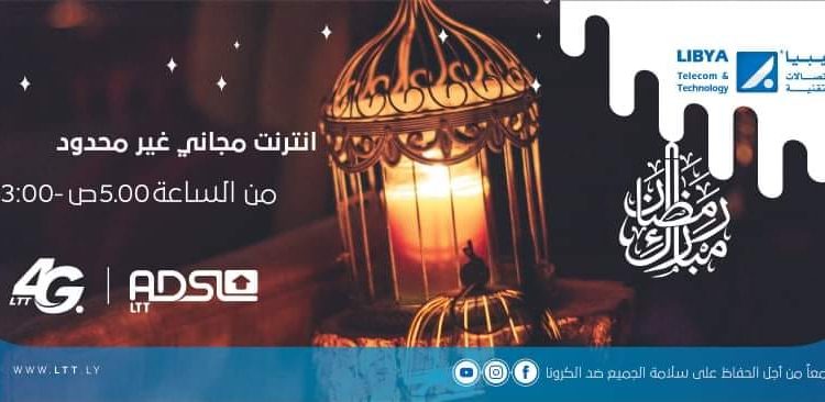 أعلنت الشركة ليبيا للاتصالات والتقينة “LTT” اليوم الخميس تغيير ساعات الانترنت المجاني غير المحدود خلال شهر رمضان، وذلك من الساعة الخامسة صباحاً وحتى الواحدة ظهراً، بدءاً من ثاني أيام شهر رمضان.