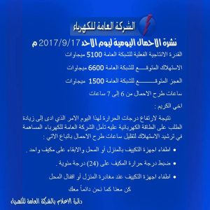 وأشارت الشركة العامة للكهرباء إلى أنه ونتيجةً لارتفاع درجة الحرارة لهذا اليوم فإنها تأمل من المواطنين المساهمة في ترشيد استهلاك الطاقة الكهربائية، والتقنين من استهلاكها في حدود الاستخدامات الضرورية للحفاظ على استقرار الشبكة.