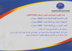وبحسب نشرة الأحمال اليومية التي نشرتها دائرة الإعلام بالشركة العامة للكهرباء فإن التوليد المتاح للشبكة العامة ليوم الخميس يصل إلى 4950 ميغا وات، والحمل المتوقع يصل إلى 6400 ميغا وات، مما يعني أن العجز المتوقع للشبكة العامة هو 1450 ميغا وات، وساعات طرح الأحمال تصل إلى سبع ساعات.