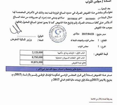 اصدرت وزارة المالية بحكومة الوفاق تفويضها المالي عن الربع الثاني من السنة المالية 2017 والخاص بمجلس النواب وقد جاء موافقا تماما للتفويض الصادر عن الربع الاول من هذه السنة اذ كانت مصاريف الباب الاول والمتمثله في المرتبات ومافي حكمها بمبلغ 2,125 مليونان ومائة وخمسة وعشرون الف دينار فيما بلغت 8,750 ثمانية ملايين وسبعمائة وخمسون الف دينار .