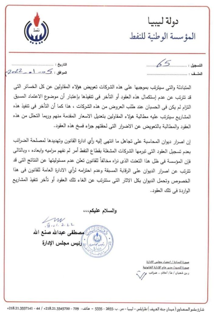 وقال خلاله: تقتضي إفادتكم بأن عدد من شركات التشغيل التابعة للمؤسسة الوطنية للنفط أخطرتنا مؤخراً بإمتناع مصلحة الضرائب عن تسجيل عقود أبرمتها مع شركات أجنبية محتجة في رفضها إلى تعميم صادر من وكيل ديوان المحاسبة يطالبها فيه ( بعدم القيام بتصديق أية عقود تبرمها الحكومة ومصالحها وهيئاتها ومؤسساتها متى كانت قيمتها 50000.000 خمسة ملايين دينار أو أكثر إلا بعد التأكد من إرفاق مايفيد موافقة ديوان المحاسبة عليها ).