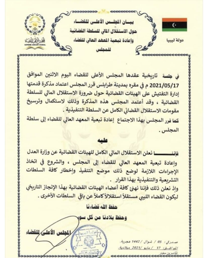 جاء ذلك في جلسة تاريخية عقدها المجلس اليوم في طرابلس وقرر اعتماد مذكرة ضرورة الاستقلال المالي للسلطة القضائية .