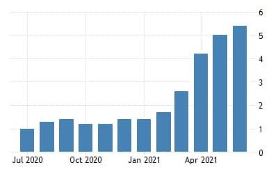 2- بالنظر إلى معدل التضخم في أمريكا نجده وصل إلى مستوى قياسي لم يحدث منذ ثلاثين عاما ومعلوم أن الأزمة في أمريكا تُصدر إلى كل العالم حيث بدأ معدل التضخم في أمريكا بالتزايد بداية من يناير 2021 إلى أن وصل أقصاه في يونيو المنصرم حينما بلغ 5.4%.