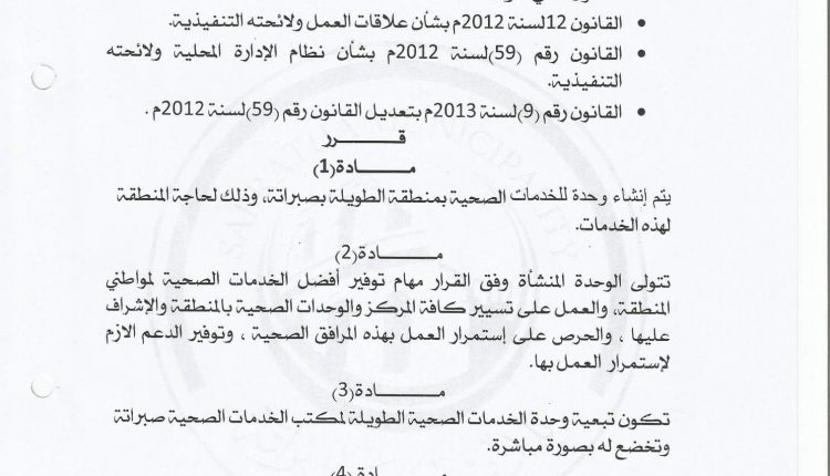 عميد بلدية صبراتة المكلف يصدر قراراً بإنشاء وحدة الخدمات الصحية بالمدينة
