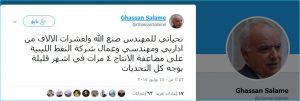 جاءت التحية عبر حساب غسان في تويتر، والذي ذكر فيه أن المهندس مصطفي صنع الله و المؤسسة الوطنية للنفط وكافة المهندسين والعاملين بمجال النفط نجحوا علي التغلب علي كافة التحديات واستطاعوا في زمن قصير مضاعفة الإنتاج لأربعة مرات.