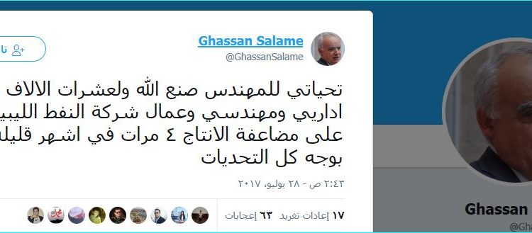 جاءت التحية عبر حساب غسان في تويتر، والذي ذكر فيه أن المهندس مصطفي صنع الله و المؤسسة الوطنية للنفط وكافة المهندسين والعاملين بمجال النفط نجحوا علي التغلب علي كافة التحديات واستطاعوا في زمن قصير مضاعفة الإنتاج لأربعة مرات.