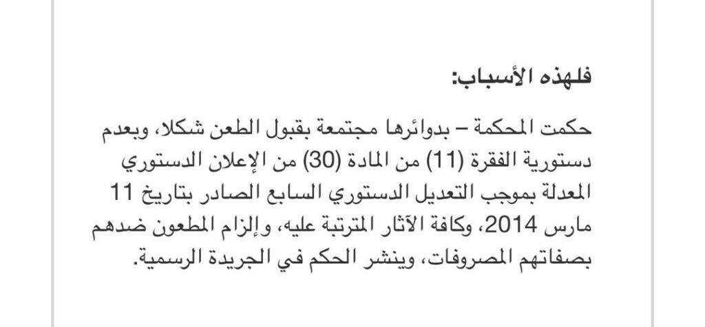إلا أنه وبتاريخ 2014/11/6م أصدرت الدائرة الدستورية بالمحكمة العليا حكمها في الطعن رقم 17 لسنة 61 ق القاضي منطوقه (حكمت المحكمة – بدوائرها مجتمعة بقبول الطعن شكلاً، وبعدم دستورية الفقرة (11) من المادة (30) من الإعلان الدستوري المعدلة بموجب التعديل الدستوري السابع الصادر بتاريخ 11 مارس 2014، وكافة الآثار المترتبة عليه، وإلزام المطعون ضدهم بصفاتهم المصروفات، وينشر الحكم في الجريدة الرسمية).