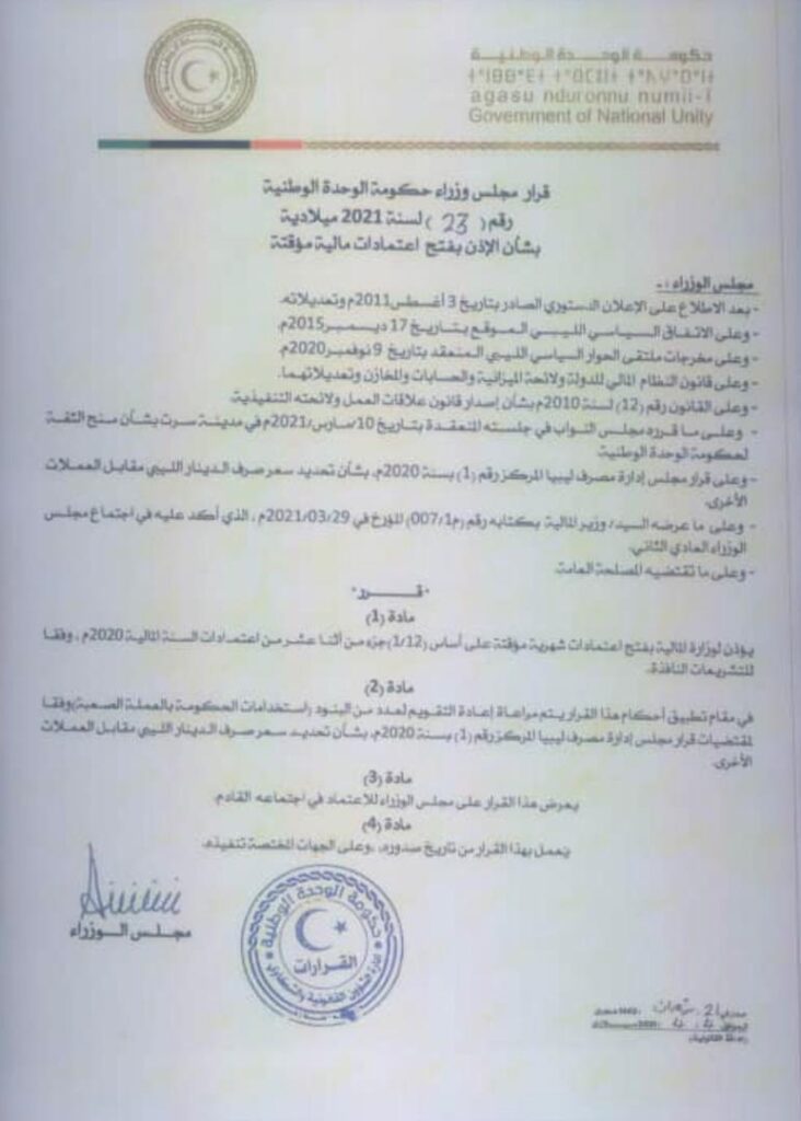 صدر بتاريخ 2021/6/17م قرار باسم مجلس الوزراء بحكومة الوحدة الوطنية يحمل رقم 125 لسنة 2021م بشأن الإذن بفتح اعتمادات مالية مؤقتة، وقد نصت المادة الأولى منه على أن يتم صرف الميزانية على أساس (1/12) جزء من إثنى عشر من اعتمادات الميزانية المقترحة !!!