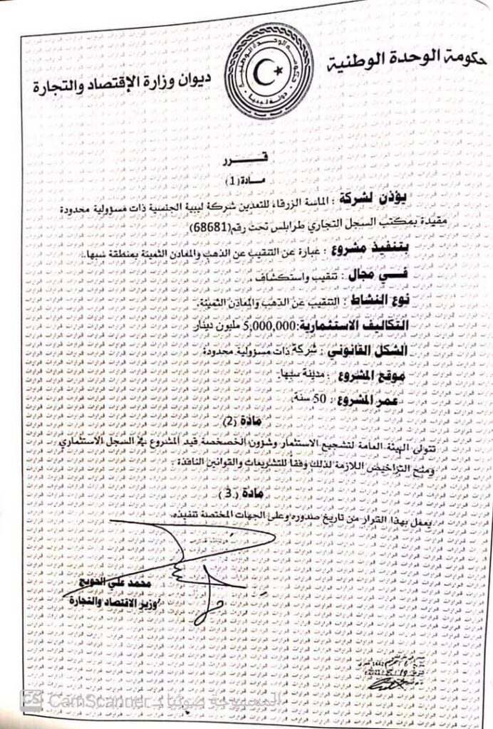 قبل أيام تناولت مواقع التواصل الاجتماعي قرار وزير الاقتصاد والتجارة رقم 417 لسنة 2020م بشأن منح الإذن بتنفيذ مشروع استثماري لصالح شركة الماسة الزرقاء للتنقيب عن الذهب والمعادن الثمينة لمدة 50 سنة بمدينة سبها .