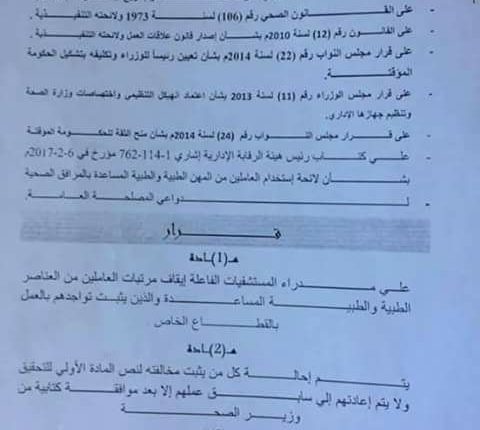 قرار وزير الصحة بحكومة الوفاق بشأن إيقاف مرتبات الطبية والطبية المساعدة والذين يتبث تواجدهم في القطاع الخاص وإحالتهم للتحقيق .
