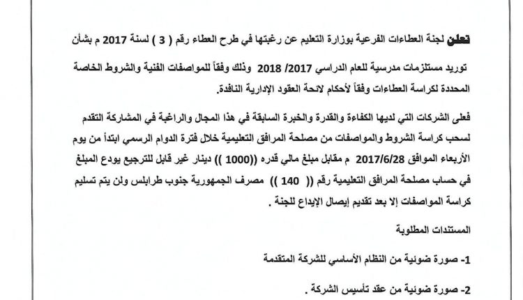 أعلنت لجنة العطاءات الفرعية بوزارة التعليم عبر صفحة الوزارة على موقع التواصل الاجتماعي فيس بوك ، عن رغبتها في طرح العطاء رقم (3) لسنة 2017 بشأن توريد مستلزمات مدرسية للعام الدراسي 2017/2018 وذلك وفقا للمواصفات الفنية والشروط الخاصة المحددة لكراسة العطاءات وفقا لأحكام لائحة العقود الإدارية النافذة.