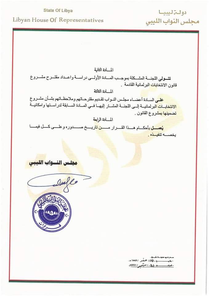 أصدر مجلس النواب الليبي قرار رقم (6) لسنة 2021 بشأن تشكيل لجنة إعداد مقترح قانون انتخاب مجلس النواب.
