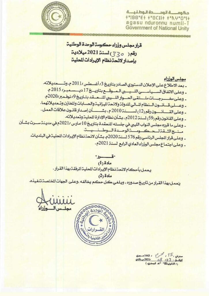 أصدر مجلس الوزراء بحكومة الوحدة الوطنية قرار رقم 330 لسنة 2021م بشأن إصدار لائحة نظام الإيرادات المحلية.