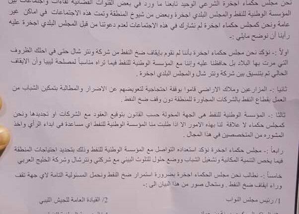عبر مجلس حكماء اجخرة في بيان رفضه القاطع لتدخل المجلس البلدي في اختصاصات المؤسسة الوطنية للنفط . حيث اقر مجلس الحكماء ان المؤسسة الوطنية للنفط هي الجهة الوحيدة المخولة بابرام او تجديد او فسخ عقود الشركات حسب ماتراه مناسبا وبما يتماشى مع مصلحة الوطن.