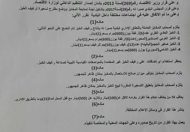 وقد منع القرار استخدام إضافات على رغيف الخبز غير المعتمدة بالمواصفات القياسية الليبية لصناعة رغيف الخبز ، وألزم القرار أصحاب المخابز بتوفير ميزان صالح للاستعمال بالمخبز بمكان ظاهر، إضافة إلى تعليق التسعيرة المقرر لبيع الخبز، وحذر القرار بمعاقبة كل المخالفين بغرامة لا تقل عن 100 دينار ولاتزيد عن 500 دينار مع قفل المخبز أو المحل لمدة 15 يوما.