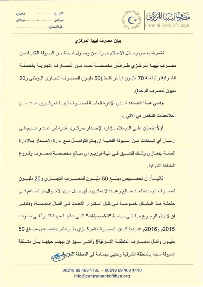 أصدر مصرف ليبيا المركزي البيضاء بياناً بخصوص وصول شحنة من السيولة النقدية من مصرف ليبيا المركزي طرابلس مخصصة لعدد من المصارف التجارية بالمنطقة الشرقية والبالغة 70 مليون دينار.