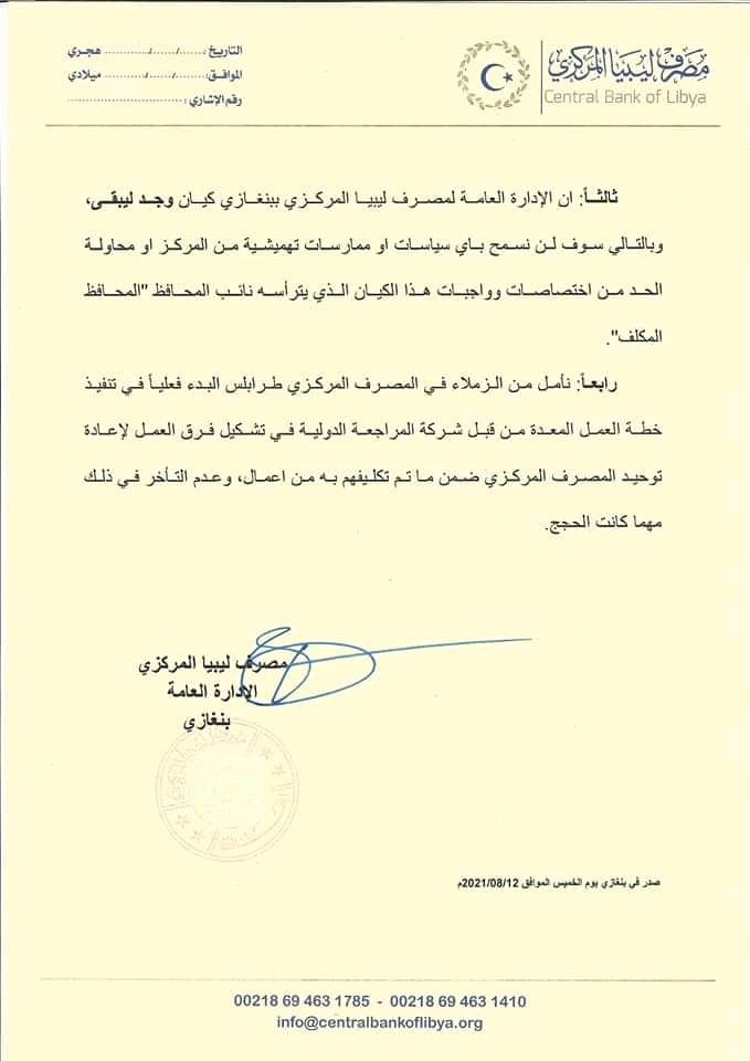 وقال البيان: الإدارة العامة لمصرف ليبيا المركزي ببنغازي كيان وجد ليبقى، وبالتالي سوف لن نسمح بأي سياسات أو ممارسات تهميشية من المركز أو محاولة الحد من اختصاصات، كما نأمل من الزملاء في مصرف المركزي طرابلس البدء فعلياً في تنفيذ خطة العمل المعدة من قبل شركة المراجعة الدولية في تشكيل فريق العمل لإعادة توحيد المصرف المركزي ضمن ما تم تكليفهم به من أعمال وفقاً للبيان.