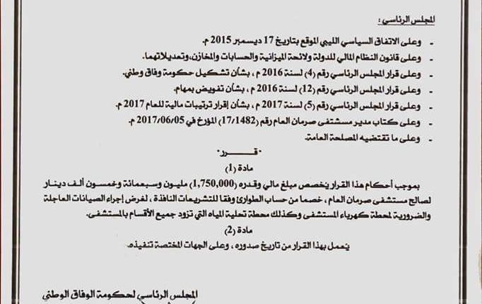 أعلن المجلس الرئاسي لحكومة الوفاق الوطني اليوم على صفحته على موقع التواصل الاجتماعي فيس بوك ، أنه قرر تخصيص مبلغ مالي خصما من حساب الطوارئ لغرض صيانة مستشفى مدينة صرمان العام ، و يقدر المبلغ بحوالي مليون و سبعمائة و خمسون ألف دينار ليبي .