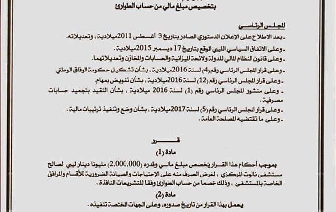 أعلن المجلس الرئاسي على صفحته على موقع التواصل الاجتماعي فيس بوك أنه خصص مبلغ مليوني دينار ليبي لمستشفى نالوت المركزي ، و ذلك لغرض عمل صيانة عاجلة لعدد من المرافق في المستشفى .