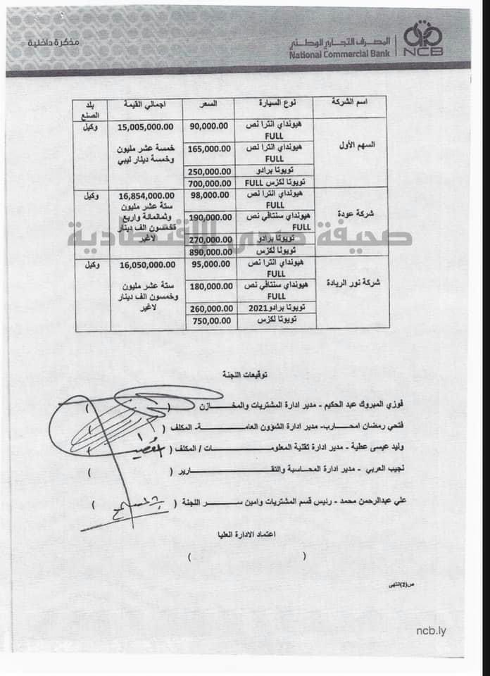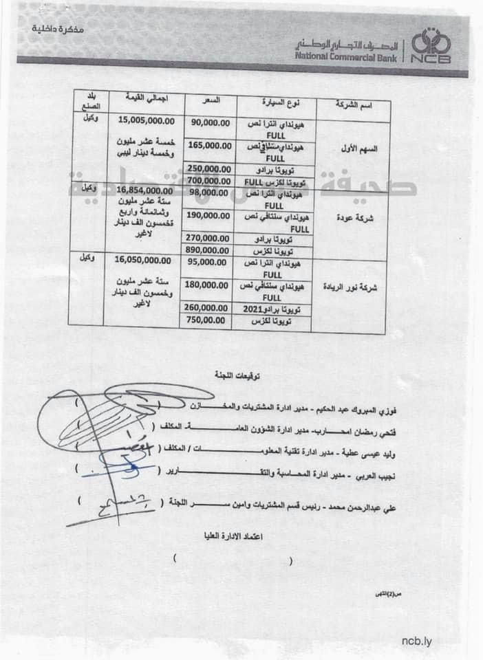 ووفقا للمصدر بالمصرف التجاري فقد تم توزيع هذه السيارات والإستلام كذلك مع إشارة المصدر إلى التقرير السابق الصادر عن لجنة المشتريات الخاصة بعدة مقترحات لشراء السيارات بحسب تصريحه .
