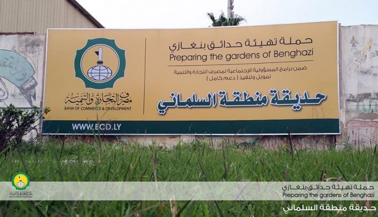 وأوضح مصرف التجارة والتنمية أنه قد بدأ فعليا بتهيئة وصيانة حديقة منطقة السلماني بمدينة بنغازي، وذلك بالتنسيق مع قسم الحدائق والمتنزهات وبلدية بنغازي، حيث سيتكفل المصرف بتهيئة الحدائق غير المتعاقد عليها من البلدية.