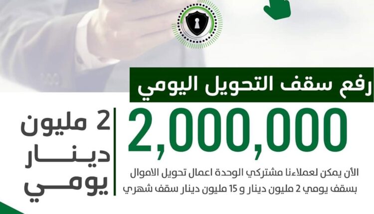 وأضاف المصرف في بيان مقتضب: “تلبية لاحتياجات عملاءنا ومشتركي خدمة الوحدة أعمال تم رفع سقف التحويل اليومي للأموال إلى 2 مليون دينار و15 مليون دينار شهريًا”.