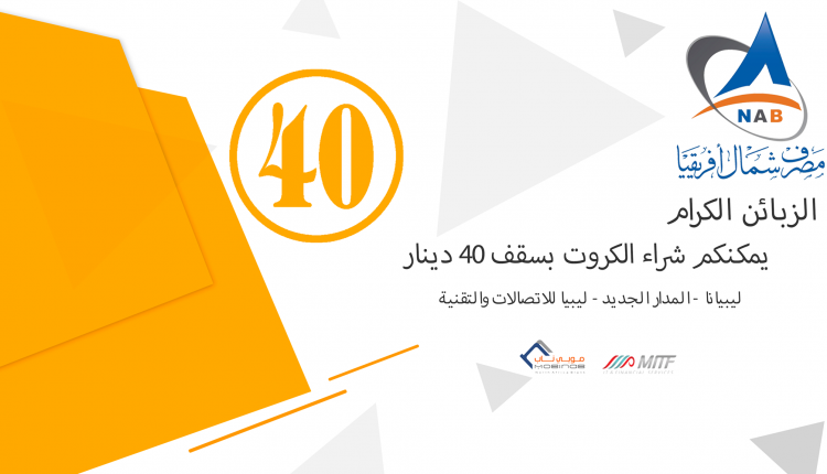 أعلن مصرف شمال أفريقيا اليوم الاثنين عن رفع سقف شراء بطاقات شحن كروت ( ليبيانا _ المدار_ ليبيا للاتصالات والتقنية) وذلك بسقف سحب يومي يصل إلى 40 دينار، في حين كان الحد الأقصى (5_10) دينار.