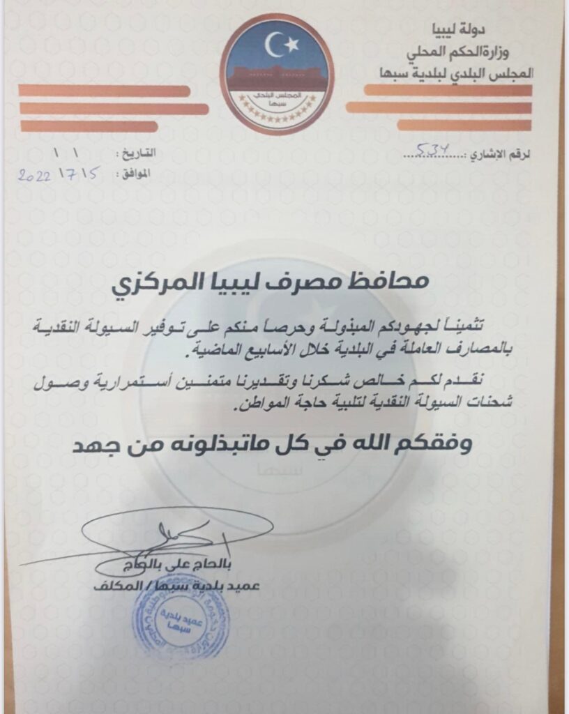 وجه عميد بلدية سبها المكلف مراسلة إلى محافظ مصرف ليبيا المركزي والتي تضمنت شكره على توفير السيولة بالمصارف العاملة في البلدية خلال الأسابيع الماضية .