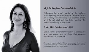 وسوف تقام وقفة إحتجاجية يوم الجمعة 20 أكتوبر أمام السفارة المالطية برلين للتنديد بمقتل الصحفية دافني .