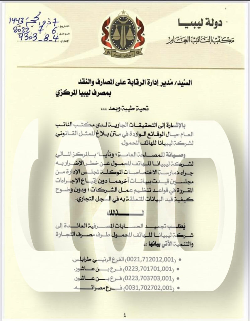 وجه وكيل النيابة بمكتب النائب العام مراسلة لإدارة الرقابة بمصرف ليبيا المركزي والتي طالب فيها تجميد حسابات شركة ليبيانا طرف مصرف التجارة والتنمية والوحدة.