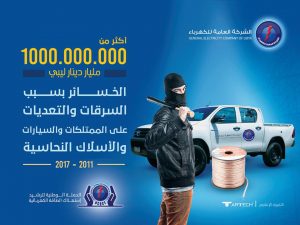 قالت الشركة العامة للكهرباء بأن مليار دينار ليبي هي الخسائر التي تكبدها القطاع جراء السرقات والتعديات على السيارات والممتلكات والاسلاك النحاسية منذ 2011 وحتى 2017، وذلك عبر منشور وضعته الشركة على صفحتها الرسمية.