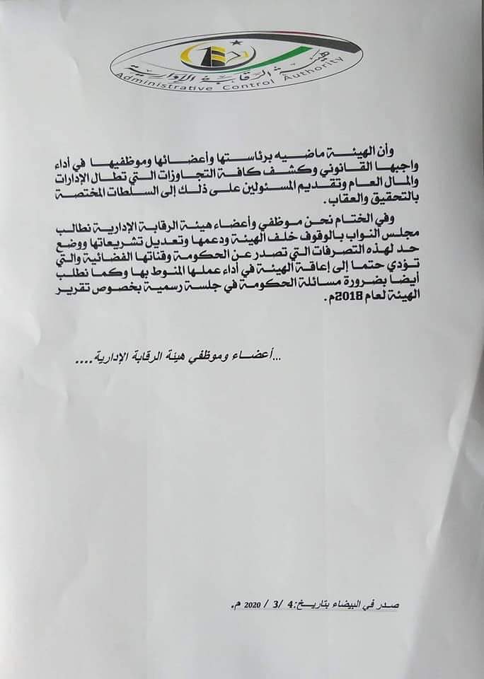 أصدر موظفو هيئة الرقابة الإدارية بالبيضاء بياناً بشأن الادعاءات المتداولة حول انتهاء الفترة المحددة لرئيس هيئة الرقابة الإدارية “عبد السلام الحاسي”.