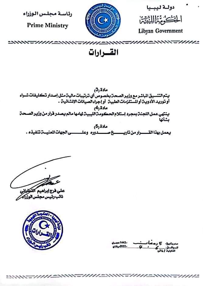 حيث نص القرار على تشكيل لجنة من المختصين لمتابعة الخدمات الصحية بالمنطقة الشرقية، وذلك على نحو الثالي حسن عياد رئيساً ومحمد علي التومي نائباً وملهم الدرسي عضواً سليمان عمر تشاد عضواً وهمام الورفلي عضواً، كما تتولى اللجنة متابعة سير الخدمات والمرافق الصحية بالمنطقة الشرقية، ويتم التنسيق مع وزير الصحة بخصوص أي ترتيبات مالية مثل اصدار وتكليفات شراء أو توريد الأدوية والمستلزمات الطبية، وينتهي مهام اللجنة بمجرد استلام الحكومة الليبية لمهامها مالم يصدر وزير الصحة قرار بشأنها .