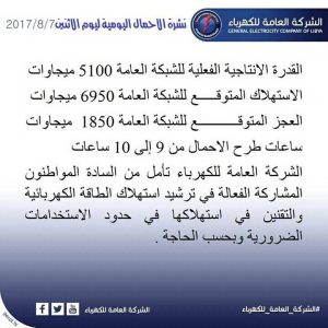 اعلنت الشركة العامة للكهرباء عبر مكتبها الاعلامي عن ساعات طرح الاحمال والانتاج المتوقع والعجز في التوليد لليوم الإثنين 7/8/2017 والتي ستكون من 9 الى 10 ساعات .