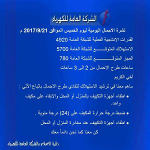 أخبار نشرة الأحمال اليومية للشركة العامة للكهرباء بواسطة Echo of Libya في سبتمبر 21, 2017 156 شارك اعلنت الشركة العامة للكهرباء عبر مكتبها الاعلامي عن ساعات طرح الأحمال والإنتاج المتوقع والعجز في التوليد لليوم الخميس والتي ستكون من 2 الى 3 ساعات . 156 شارك FacebookTwitterGoogle+ReddItWhatsAppPinterestالبريد الإلكتروني