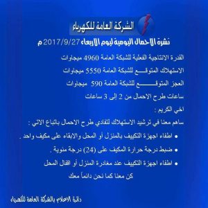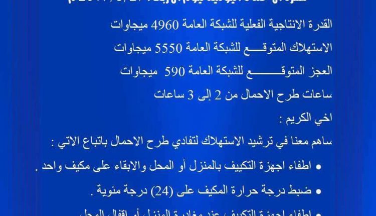 أخبار نشرة الأحمال اليومية للشركة العامة للكهرباء بواسطة Echo of Libya في سبتمبر 27, 2017 107 شارك أعلنت الشركة العامة للكهرباء عن ساعات طرح الأحمال ، والأحمال المتوقعة ، والعجز المتوقع للشبكة العامة اليوم الإربعاء وستكون ساعات طرح الأحمال من 2 إلى 3 ساعات . 107 شارك FacebookTwitterGoogle+ReddItWhatsAppPinterestالبريد الإلكتروني