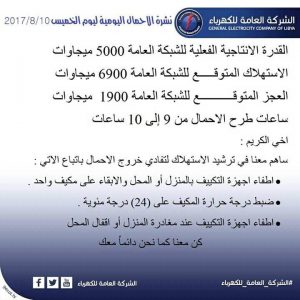 اعلنت الشركة العامة للكهرباء عبر مكتبها الاعلامي عن ساعات طرح الاحمال والانتاج المتوقع والعجز في التوليد لليوم الخميس 10/8/2017 والتي ستكون من 9 الى 10 ساعات .