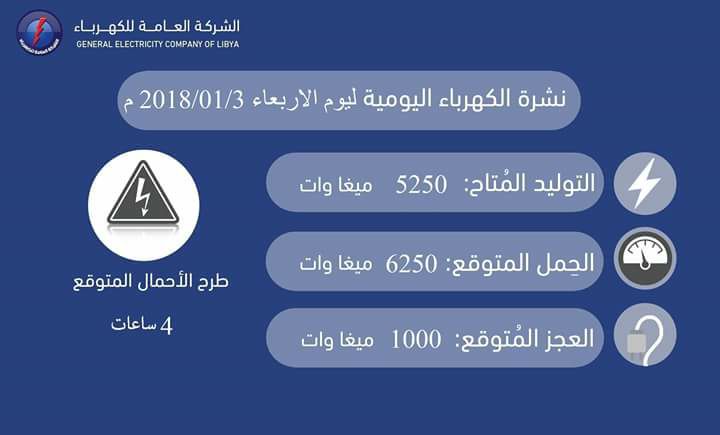 أعلنت الشركة العامة للكهرباء ان قدرة التوليد بالشبكة العامة ستكون 5250 ميغاوات ، وان الحمل المتوقع على الشبكة سيكون حوالي 6250 ميغاوات