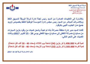 قالت شركة البريقة لتسويق النفط إن منطقة مصراته افادت بتعبئة وشحن كميات من وقود “البنزين” من مستودع مصراتة النفطي إلى مستودع سبها النفطي يومي 24 ، 25 الثلاثاء والاربعاء الماضيين