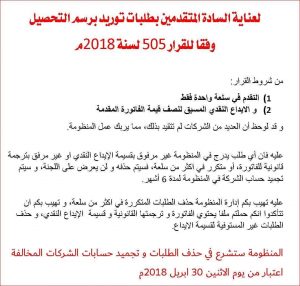 وقد ذكرت الوزارة وجوب أن يتم تقديم طلب اعتماد لسلعة واحدة ، وان يتم ايداع نصف القيمة مسبقاً.