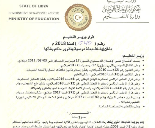 أخبار وزارة التعليم توقف 674 موفد للدراسة بالخارج بواسطة nisrin suliman آخر تحديث مارس 16, 2018 896 شارك قامت وزارة التعليم التابعة لحكومة الوفاق الوطني بإصدار قرار يقضي بإيقاف إيفاد 674 طالبا يدرسون خارج ليبيا، وذلك لمخالفتهم لائحة الإيفاد وتعديلاتها فيما يتعلق بشرط عمر الموفد. الطلبة الموفدين بالخارجحكومة الوفاق الوطنيوزارة التعليم 896 شارك FacebookTwitterGoogle+ReddItWhatsAppPinterestالبريد الإلكتروني