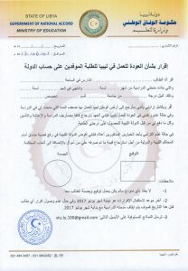 وأصدرت وزارة التعليم قرارا بشأن عودة الطلبة الموفدين للخارج على حساب الدولة الليبية إلى بلادهم بعد إتمام دراستهم ، وأن الطالب الذي لا يرغب في العودة عليه إعادة المبالغ التي صرفت عليه وإلا فإنه سيتم اللجوء للقضاء.