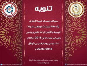 أعلنت وزارة المالية بحكومة الوفاق الوطني أن مصرف ليبيا المركزي سيباشر اعتبارا من يوم غدٍ الخميس في إحالة المرتبات لموظفي الدولة الليبية بالكامل تباعا لشهريْ يناير وفبراير من العام الحالي 2018.