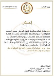 أعلنت وزارة المالية بحكومة الوفاق الوطني لجميع الجهات الممولة من الميزانية العامة للدولة عن تمديد المهلة الممنوحة لاستلام مقترحات الميزانية للسنة المالية 2018 حتى نهاية دوام يوم الثامن من نوفمبر القادم.