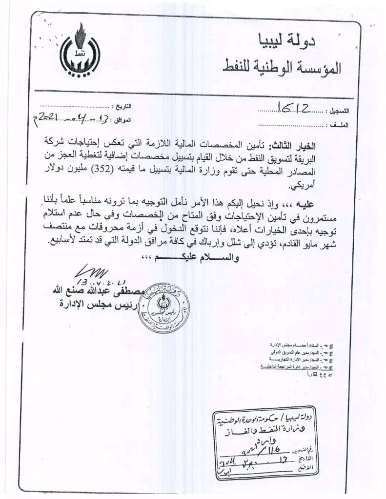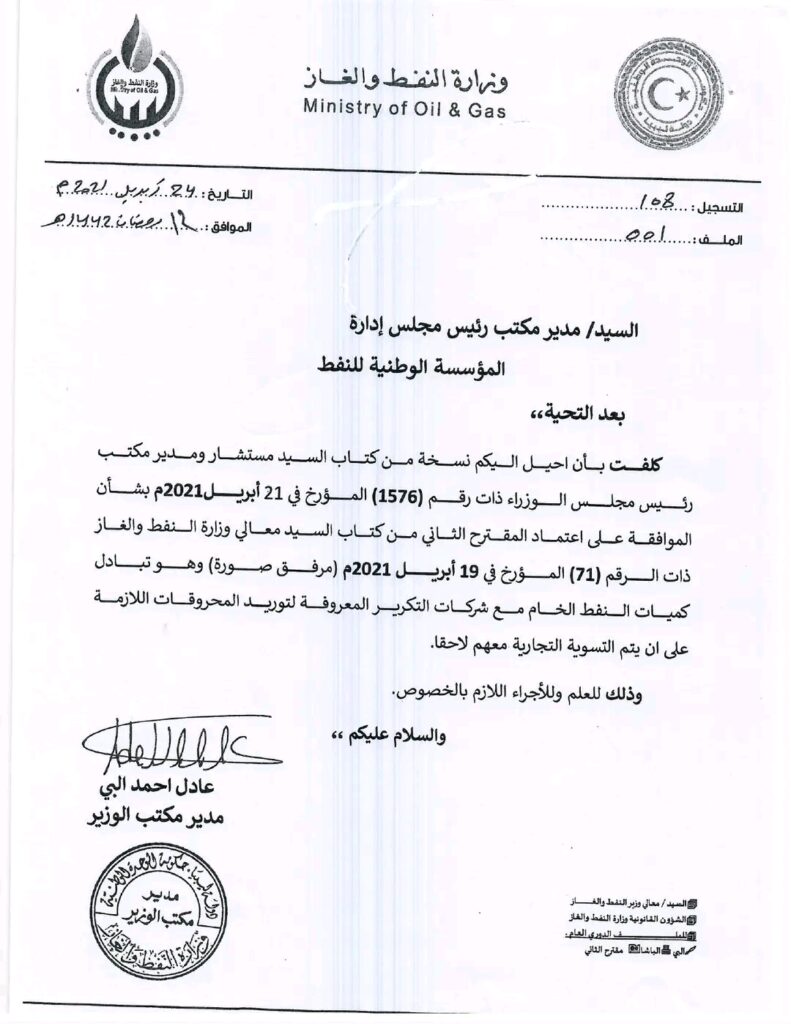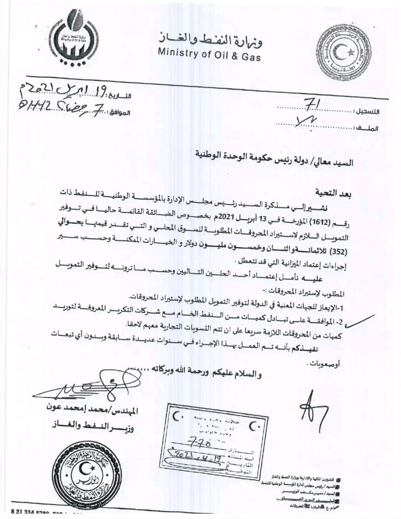 كما أوضحت الوزارة بأن المراسلات التي بدأت بطلب المؤسسة الوطنية للنفط في 13-أبريل-2021م التمويل اللازم أو مبادلة شحنات نفط خام بمحروقات، ومذكرة وزراة النفط والغاز المؤرخة 19-أبريل-2021م إلى رئاسة الحكومة وموافقة الحكومة الليبية عليها بتاريخ 21-أبريل-2021م والتي وافقت فيها على مبادلة شحنات نفط خام بمحروقات وهي موافقة مفتوحة غير محددة، بالإضافة إلى ما أحالته وزارة المالية من تمويل للمؤسسة الوطنية للنفط لهذا البند.