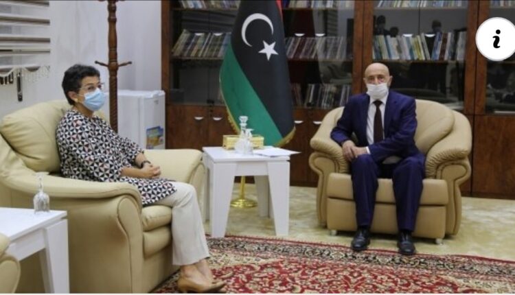 ووفق بيان للمجلس، تناول لقاء عقيلة صالح مع وزيرة الخارجية الإسبانية في بلدة القبة شرق البلاد تطورات الأوضاع في ليبيا وسُبل إنهاء الأزمة ودعم وقف إطلاق النار والوصول إلى حل سياسي.